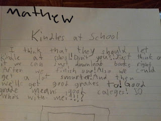 Then, later that same week, I had a parent-teacher conference with the teacher of my eleven-year-old son. For those of you who follow my Twitter stream, Mathew has been the source of #TenYearOldWisdome and #ElevenYearOldWisdom. The teacher showed us an argumentative essay Mathew had to write for class. The title is "Kindles at School."